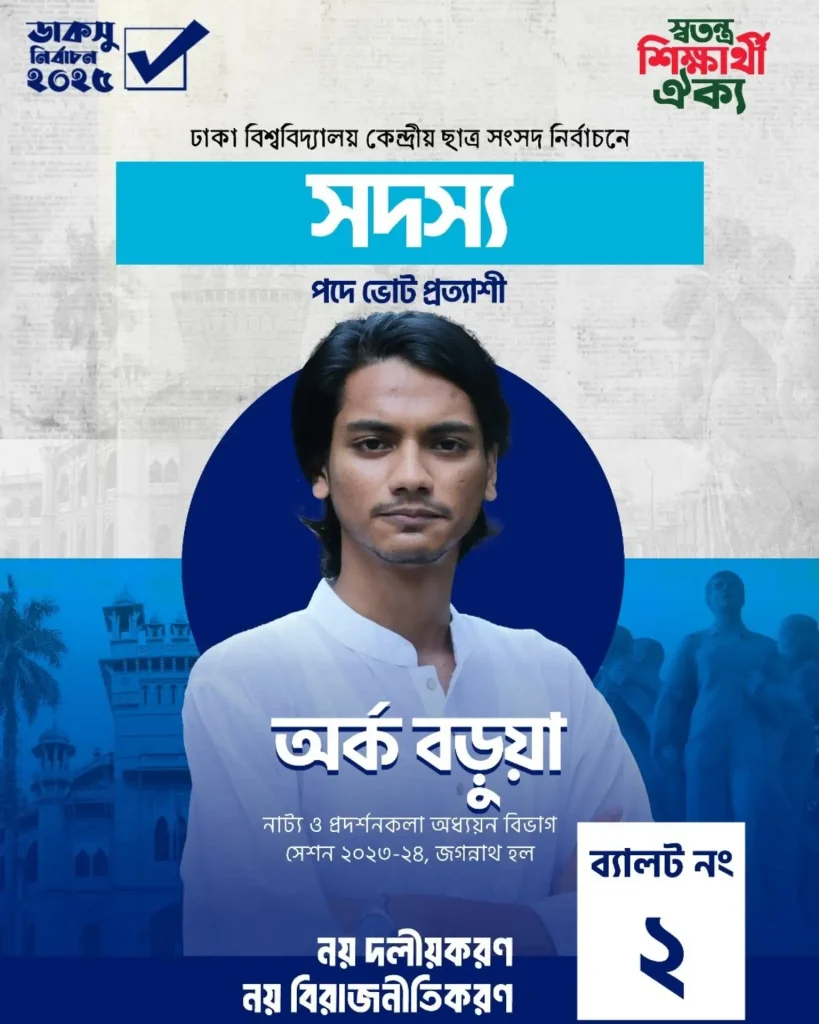 আমি রক্তবীজ অর্ক বড়ুয়া। মানুষের জন্য মানুষ হিসেবে আমার লড়াই চলমান আছে। ডাকসুতে কেন্দ্রীয় সদস্য পদে প্রতিদ্বন্দিতা করছি ২ নম্বর ব্যালট নিয়ে। আপনার ভোট ও সহযোগীতা প্রত্যাশী।